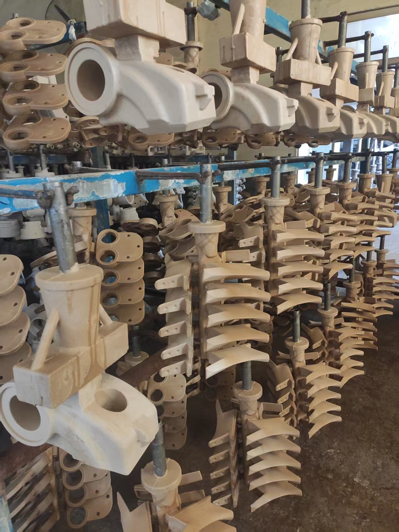 The wax sprue has now been “invested” in ceramics, making the mold for metal to be pouring into. The ceramic comprises of two parts: a liquid slurry topped by a dry sand bed. Each sprue is covering many layer of slurry and sand until the ceramic shell is strong enough for the casting process. It takes between two days and two weeks for shells to dry, depending on how they form.